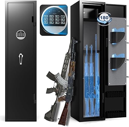 - 【Convenient Layout】Equipped with a 180° Openable Door for Easy Access to the Rifle Safes for Home, Which Can Effectively Improve the Speed of Accessing Firearms, And a Separate Small Box on the Top, Which Requires a Key to Open. More Storage Space and Safer for Valuables, With Two Pistol Packs and Two Ammo Storage Boxes on the Side, with Guns in One Step, No Need to Look Elsewhere for Ammo.