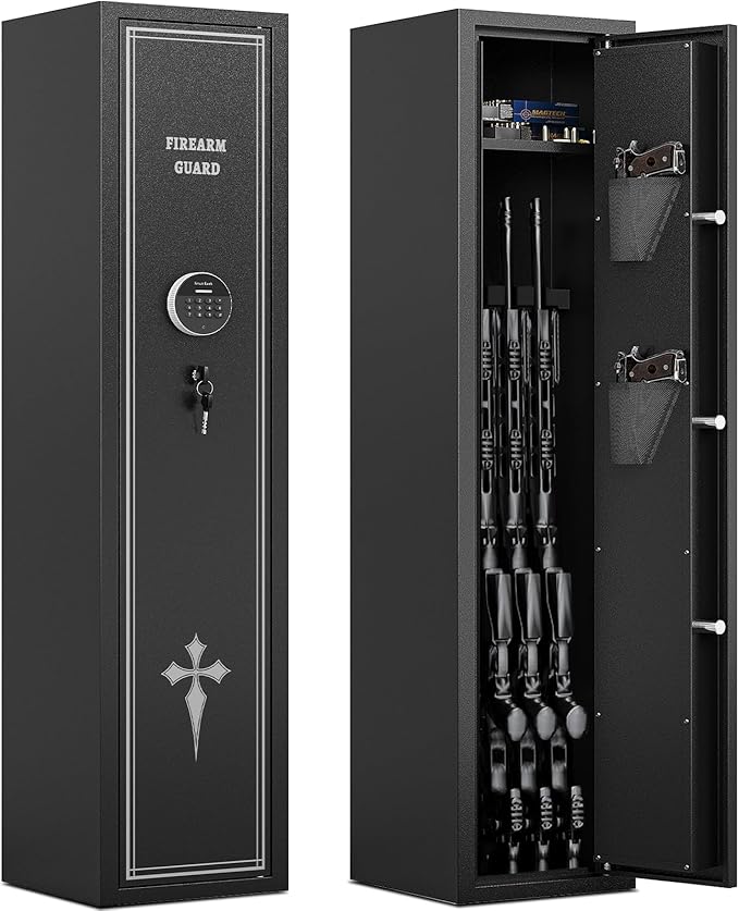 - Multi Functional Gun Cabinets:Rifle safe is independently designed to store guns and accessories separately. Adjustable shelves inside the cabinet, you can adjust the height and position according to the safes type