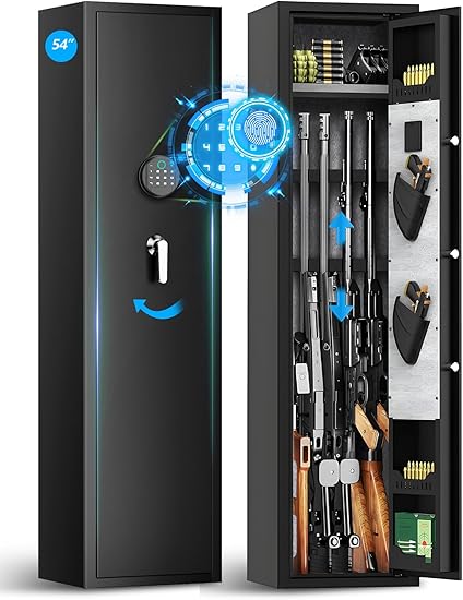 - 【5-6 LARGE GUNS CAPACITY】The gun cabinet comes with adjustable gun shelves, which can be freely adjusted according to the length of the guns.The size of our multi-functional safe:54’’H*11.8’’W*11’’D,which can store 5-6 guns. It is really nice inside has a LED light. There are two pistol holder on the inside of the door and place for box of ammo.