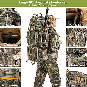 - Large Capacity & 12 Pockets – Efficiently organize all your hunting gear and accessories with our high-capacity storage compartments. The main pocket is perfect for clothes and sleeping bags, while the front pocket can hold your water bladder. The side pockets provide easy access to tripods and scopes, and the bottom pocket includes a built-in rain cover. The waist pocket can store your phone for quick access. With the freedom to plan and organize your gear as you see fit