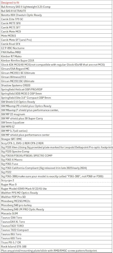 - Also fits FNH Reflex MRD, Bul SAS II ULTRALITE, S&W MP 5.7, S&W Equalizer 9mm, S&W MP 22 magnum, S&W M&P9 shield plus Optics Ready, S&W M&P shield plus performance center, S&W M&P shield plus 30 Super Carry, Mossberg MC2SC/MC2c, Masada Slim, Girsan/EAA Regard MC, Girsan MC1911 SC Ultimate, G43 MOS, 48 MOS, Walther PPS M2 Optics Ready, Stoeger SRT-9MC, Sccy CPX-1, DVG-1 RDR CPX-2 RDR, Bul Armory SAS II lightweight 3.25 Comp, Springfield Elite 3.8” Compact OSP,Hellcat OSP, Hellcat Pro/RDP.