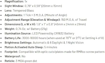 - Comes with the adjustment tool, user manual, lens cloth, rubber protective cover, CR1632 battery, screws. Parallax-free & Unlimited Eye Relief. Made of aircraft aluminum in anodized black finish with multi-coated lens. Weight approximately 21 grames(0.55oz), (Length)1.8″ x (Width)1″ x (Height).8″. 3MOA