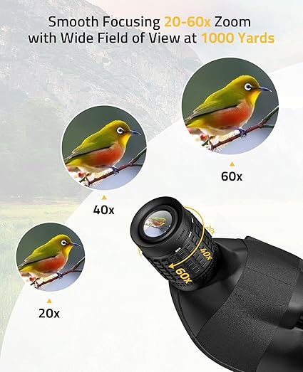 - 20-60X Powerful Magnification System: CVLIFE spotting scope feature variable 20x to 60x magnification, ensuring sharp details of the target at both close and long distances (above 1000 yards). Ideal for bird watching, wildlife observation, spotting the moon, camping, and archery