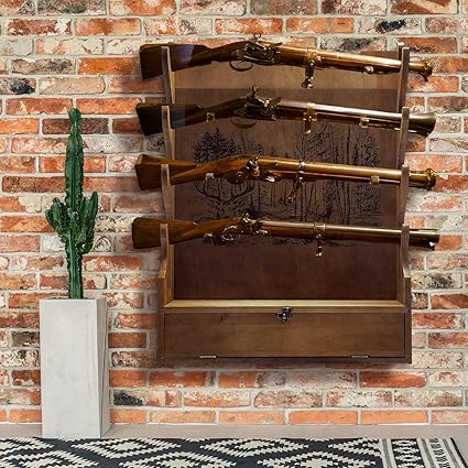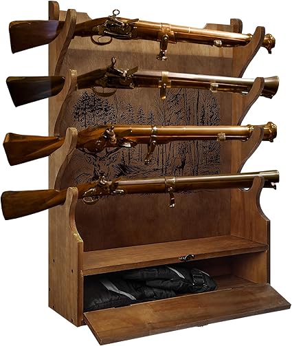 Four Gun Wooden Gun Display Rack with Cabinet Storage Compartment for Gun Accessories Gun Rack for Wall Gun Wall Mount Wall Gun Racks for Rifle Home Gun Racks with Soft Pad Deer Pattern
