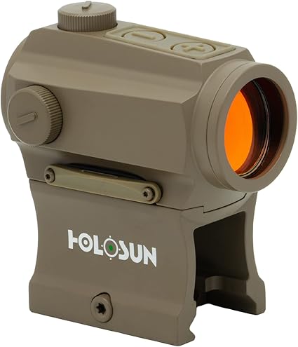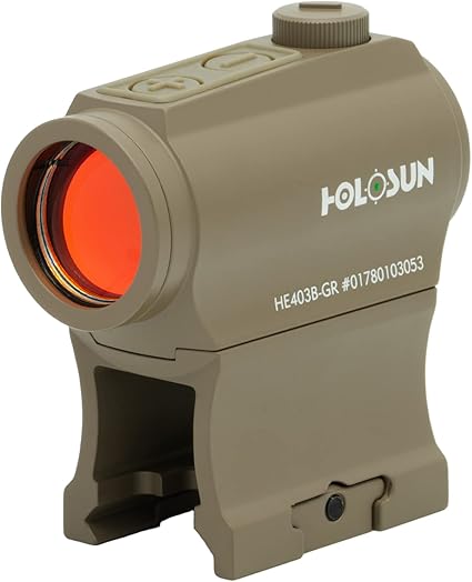 - HOLOSUN GREEN DOT SIGHT – HE403B-GR-FDE is a 20mm micro sight designed for rifle and carbine applications; It features Holosun’s ultra efficient 540nm Green Super LED with up to 50k hour battery life and 12 reticle intensity settings; The housing is made from 6061 aluminum and includes both a lower 1/3 co-witness mount (1.63″) and a low mount (.75″) for low-comb height rifle applications; Lens cloth, rubber lens cover, T10 L key, and CR2032 battery included