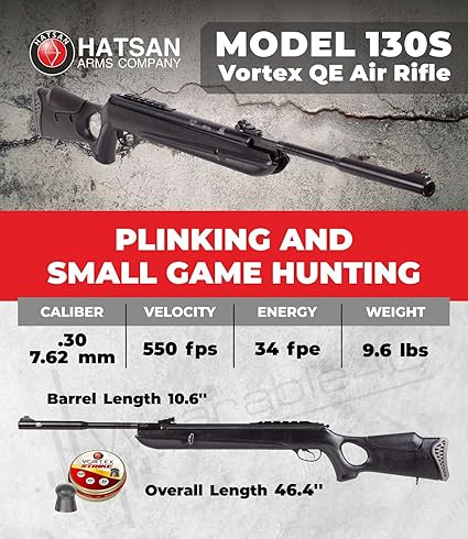 - In The Box: 1x Hatsan Mod 130S Vortex QE (Quiet Energy) Break Barrel .30 Caliber Air Rifle; 1x 3-9X40AO Scope; 1x Pack of 100x Pellets; 1x Pack of Targets; 1x Camo Digital Hat; 1x Hard Case