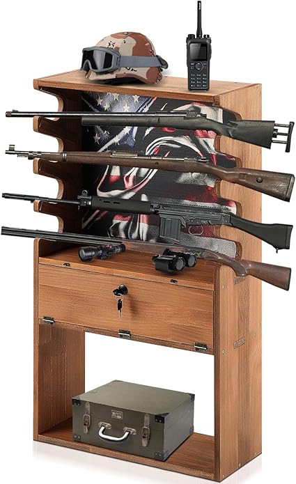 - Patriotic Charm: showcase your patriotism with our American flag gun rack; Adorned with a distressed American flag, this gun rack with storage adds a unique patriotic touch to your home; Ideal for all gun enthusiasts who want to flaunt their guns in style