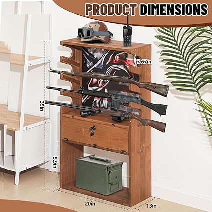 - Versatile Rifle Storage: our indoor gun rack acts as a 3 in 1 storage solution; Equipped with 4 gun hooks, a storage rack, and a drawer, it provides ample space for storing accessories like helmets, vests, belts, and more; The size of about 35 x 20 x 13 inches makes it a compact yet spacious addition to your home