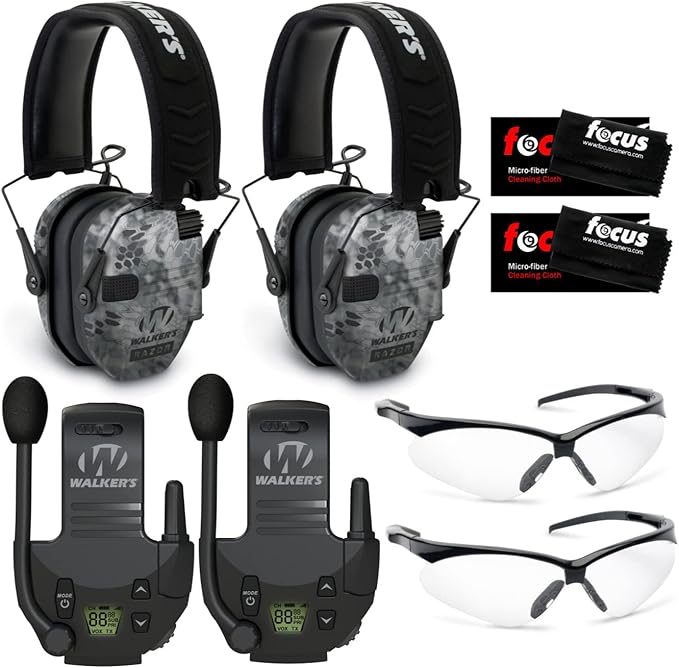 - Bundle Includes: 2 x Walkers Razor Digital Ear Muffs (Raid Kryptek), 2 x Walker’s Razor Tactical/Hunting Walkie Talkie Attachment, 2 x Walker’s Crosshair Sport Shooting Glasses (Clear), 2 x Microfiber Cleaning Cloths