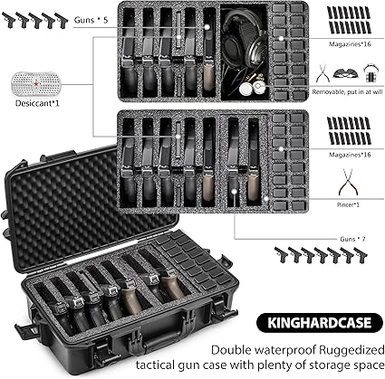 - Custom pre-cut compartments: Compatible with 7 handguns and 16 magazines. The carefully designed foam allows for easy storage of firearms and magazines. The pre-cut design fits most handgun models on the market, for the Glock, Sig Sauer, and other firearms with a length of less than 11 inches. Pistols are positioned for quick access, allowing them to be picked up safely by their grip